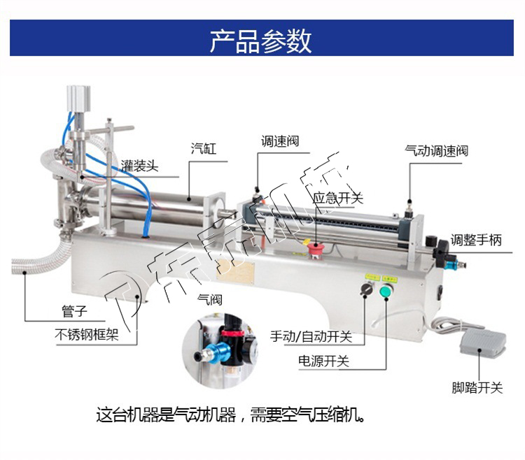 小型液體定量灌裝機(jī),通過氣缸帶動(dòng)一個(gè)活塞來抽取和打出物料,用單項(xiàng)閥控制物料流向,小型液體定量灌裝機(jī)用磁簧開關(guān)控制氣缸的行程,即可調(diào)節(jié)灌裝量。