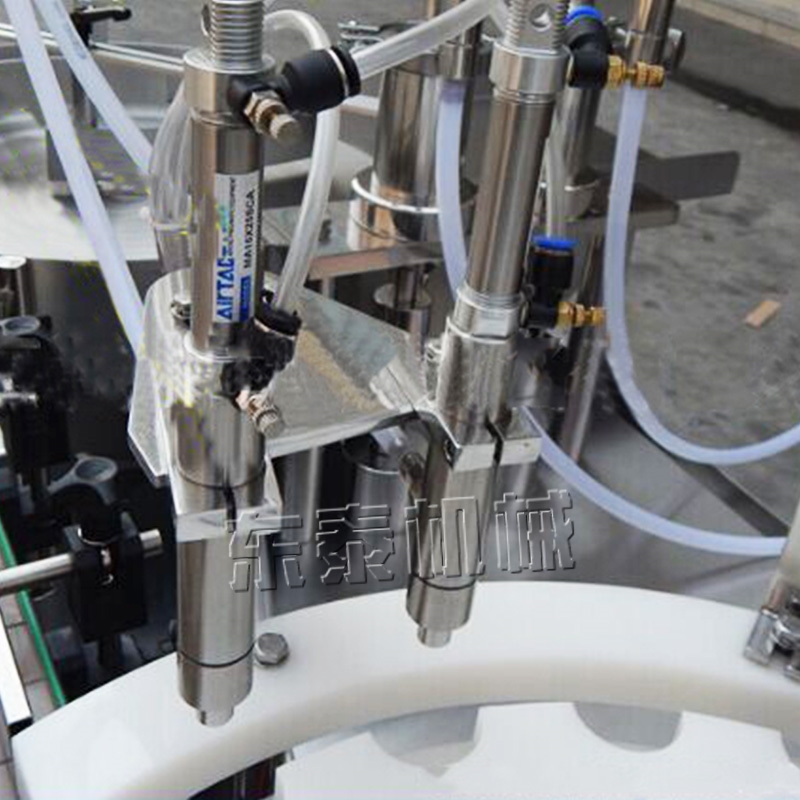 1、小瓶藥液灌裝旋蓋機(jī)采用機(jī)械手將蓋密封,并設(shè)有自動打裝